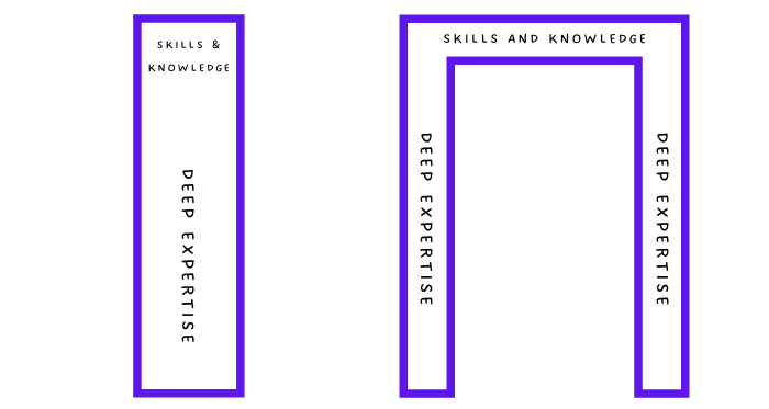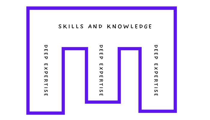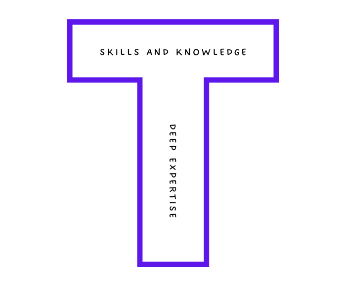 A T-shaped person is a label for someone with a broad range of skills and knowledge in multiple areas (the horizontal bar of the T) while having deep expertise in one specific field (the vertical bar of the T).
